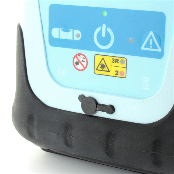 Eenvoudige bediening Deze roterende laser heeft een radicaal vereenvoudigde bediening. Er zijn slechts drie knoppen op de bouwlaser zelf: aan/uit, antischudden en een knop om de laserklasse te selecteren. Extra functies worden alleen geleverd met de afstandsbediening. Dit maakt het mogelijk voor een incidentele gebruiker om het apparaat achter te laten zonder de afstandsbediening. Je hebt dan de zekerheid dat het apparaat alleen in zelfnivellerende rotatie kan worden gebruikt. Foutieve metingen door verkeerde bediening zijn dan uitgesloten.